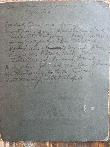 Back of photo: Vancleave, Montgomery and Gillispie families at farm in Frederick, Oklahoma
